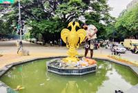 An artist gives final touches to two headed bird statue at police circle near Hudson circle, in Bengaluru on Thursday 8th August 2024