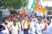 BJP State President BY Vijayendra with BJP leaders celebrate the victory of BJP in Haryana assembly election, in Bengaluru on Tuesday 8th October 2024