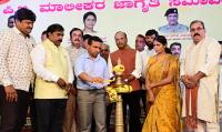 Former Mayor Gangambika Mallikarjuna with Retd. Police officer SK Umesh and PG Owners during the inauguration of PG Owners Awareness convention, in Bengaluru on Wednesday 16th October 2024
