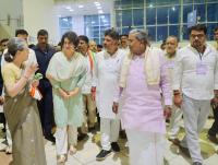 Congress leader Sonia Gandhi and Congress General Secretary Priyanka Gandhi being welcomed at the Mysore Airport by Karnataka CM Siddaramaiah and DCM DK Shivakumar, in Mysuru on Tuesday 22nd October 2024