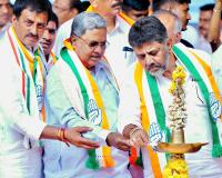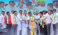 Chief Minister of Karnataka Siddaramaiah with DCM DK Shivakumar and Congress leaders during the public meeting for Channapatna by-poll election campaign, in Channapatna on Monday 11th November 2024