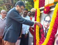 BBMP Commissioner Tushar Girinath and others offering floral tributes to the Babasaheb Dr. B.R. Ambedkar portrait at BBMP office as part of the 68th Maha Parinirvana Diwas, in Bengaluru on Friday 6th December 2024