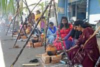 Residents of Sudham Nagar draw Rangoli and prepare Pongal in front of their residences on the occasion of Makara Sankranti (Pongal ) festival, in Bengaluru on Tuesday 14th January 2025