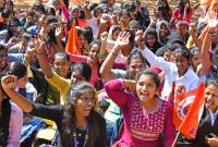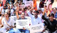 ABVP members and students staging a protest against the state government decision to closing of 9 universities, in Bengaluru on Monday 17th February 2025