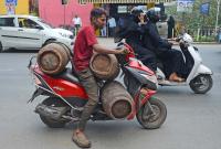 A man transporting LPG cylinders on his two wheeler at Queens Road , in Bengaluru on Tuesday 8th April 2025