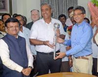 Administrator Umashankar giving charge to Tushar Girinath and outgoing BBMP Commissioner Tushar Girinath giving charge to New BBMP Commissioner Maheshwar Rao at BBMP office, in Bengaluru on Wednesday 30th April 2025