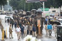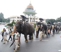 Dasara jamboo savari elephants strolling around the Mysuru City, ahead of Mysuru Dasara jamboo savari procession, in Mysuru on Monday 11th August 2025