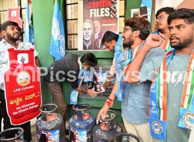 Photo Caption : Members of NSUI staged a protest against the LPG shortage, outside the office of Union Minister Nirmala Sitharaman at Ali Asker Road, in Bengaluru on Thursday 12th March 2026