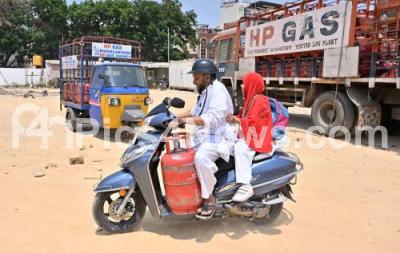 Photo Caption : A man with his daughter taking a LPG Cylinder on the scooter at Shivajinagar, due to shortage of Cylinder supply, in Bengaluru on Saturday 14th March 2026